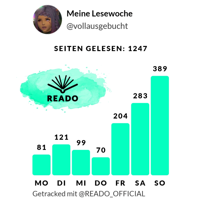 Und schon schreiben wir wieder Montag, Zeit, einen kurzen Blick zurück auf die letzte Woche zu werfen. Diesmal war ich richtig fleißig, denn ich habe 5 Bücher beendet, 2 davon waren eBooks. Insgesamt bin ich so auf 1.247 Seiten gekommen.
