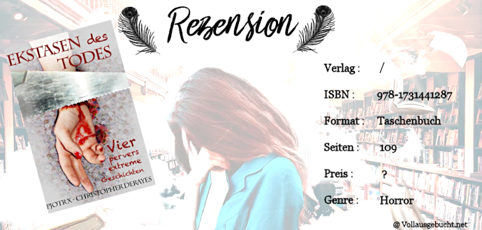 Für „Ekstasen des Todes“ haben Pjotr X und Christopher Derayes je 2 Kurzgeschichten beigesteuert, eine wirklich kurze und eine etwas längere, Pjotr X ist mit „Todesschuss“ und „Ein Spanferkel namens Lena“ vertreten, während Christopher Derayes „Der Bulle und das Mädchen“ und „Ewig der Deine“ beigesteuert hat.