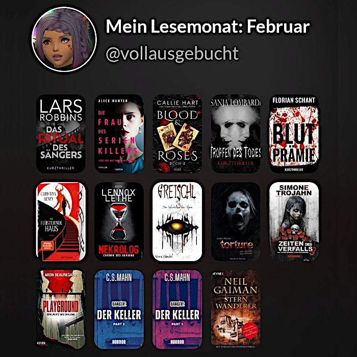 Nun ist auch der zweite Monat des Jahres um und irgendwie fühle ich mich immer noch, als wäre erst gestern Silvester gewesen, dabei steht die Leipziger Buchmesse schon vor der Tür. Na ja, ein bisschen Zeit ist bis zum Gedrängel in den heiligen Hallen ja noch und so gibt es erstmal meinen Monatsrückblick. Im Februar habe ich 14 Bücher gelesen, wobei die eBooks mit 10:4 diesmal eindeutig gewonnen haben. Insgesamt bin ich auf 3.068 Seiten gekommen. Einen Favoriten habe ich nicht, ich mochte Neil Gaimans „Sternwanderer“, was fürs Herz, und Aron Beauregards „Playground“, eher etwas für meine dunkle Seele, aber auch „Das flüsternde Haus“ von Christina Henry hat Spaß gemacht, ich bin halt auch ein kleiner Filmfreak.