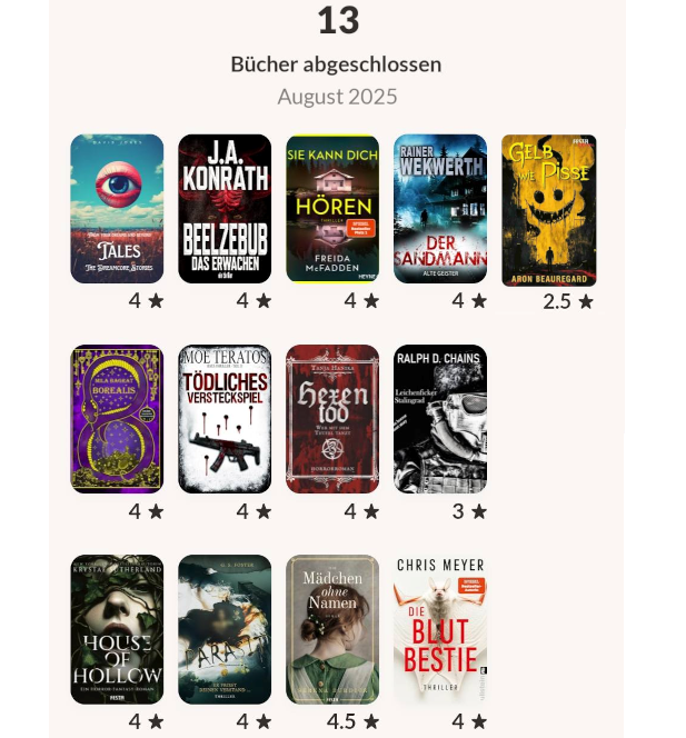 Mal wieder reichlich spät, aber hier ist er, mein Monatsrückblick für August, bevor der September um ist und damit bereits der nächste fällig. Insgesamt habe ich 13 Bücher gelesen, 6 Prints und 7 eBooks und auch diesmal waren wieder 2 Bücher dabei, die so gar nicht mein Ding waren. Zum ersten war da „Gelb wie Pisse“ von Aaron Beauregard. „Playground“ fand ich ja sehr unterhaltsam, ja ich böse, ich.^^ Dem neuesten Festa Extrem Band konnte ich allerdings gar nichts abgewinnen, die Story war einfach nur vollkommen unglaubwürdig und hat mich gar nicht abgeholt. Aber auch „Der Leichenficker von Stalingrad“ hat mich nicht gecatcht. Das ich bei dem Thema keine anspruchsvolle Geschichte erwarten kann, war mir durchaus bewusst, aber der Schreibstil und auch der Plot waren mir einfach zu platt.
