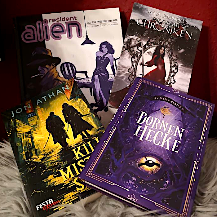 Außerdem gab es mit Teil 24 der „Grimm-Chroniken“ und „Dornenhecke“ zwei düster angehauchte Ausflüge ins Märchenreich. Während in den „Grimm-Chroniken“ der langerwartete Krieg der Farben ausbricht und ein interessantes Geheimnis gelüftet wird, wirft „Dornenhecke“ einen etwas anderen Blick auf Dornröschen. In T. Kingfishers Novelle ist die schlafende Schönheit nämlich alles andere als eine liebenswerte Prinzessin. Hier spürt man auf jeder Seite die Liebe der Autorin zu Außenseitern und genau dafür feiere ich sie jedes Mal aufs Neue und genau deswegen gibts von mir eine fette Leseempfehlung. Ich habe von ihr jetzt noch „The Hollow Places“ hier liegen, darauf bin ich echt gespannt.