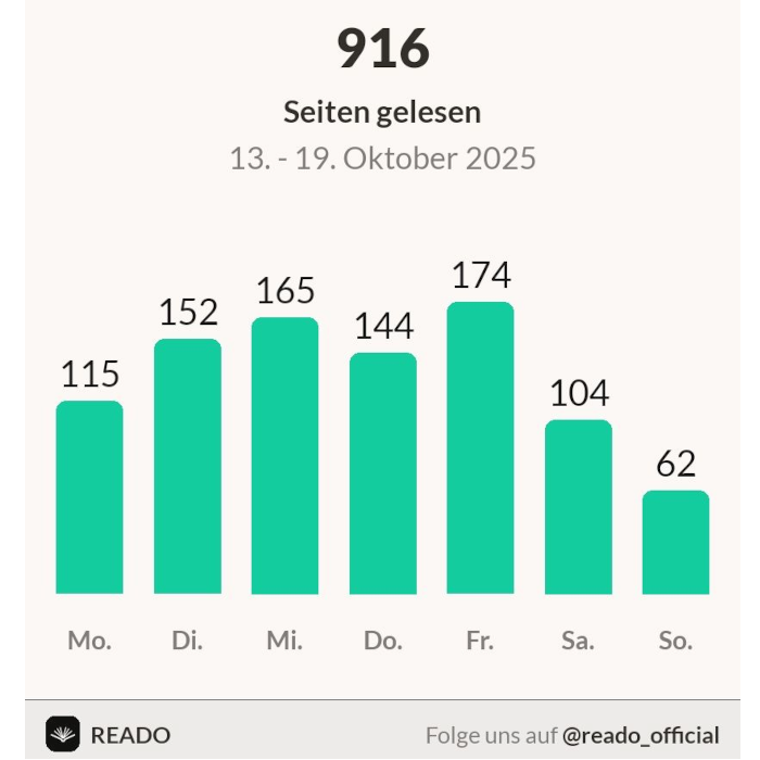 Die Zeit vergeht momentan echt schnell, ich hab das Gefühl, gerade erst meinen Wochenrückblick gepostet zu haben und schon ist der nächste fällig. Mit 916 gelesenen Seiten und 4 abgeschlossenen Büchern war ich ganz gut unterwegs, faszinierenderweise habe ich am Wochenende, wo ich eigentlich die meiste Zeit habe, am wenigsten gelesen. Aber es gibt halt auch noch andere Dinge im Leben, wobei, eigentlich hab ich nur gefaulenzt und versucht meine Erkältung auszukurieren.