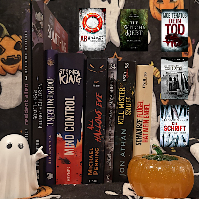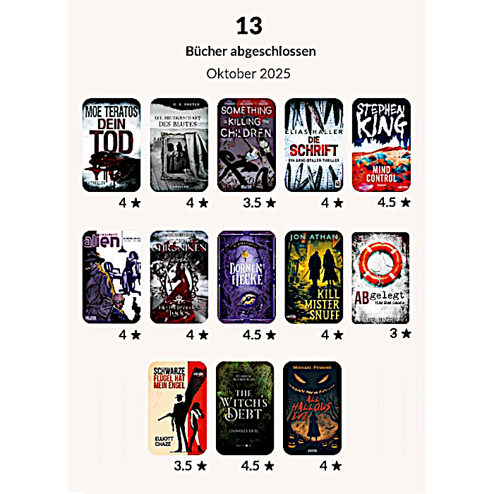 Im Oktober habe ich 13 Bücher gelesen, 8 Prints und 4 eBooks und im Großen und Ganzen bin ich recht zufrieden mit meiner Auswahl. „ABgelegt“ und „Schwarze Flügel hat mein Engel“ waren nicht ganz nach meinem Geschmack, bei ersterem fand ich die Story ziemlich unglaubwürdig und auch nicht sonderlich fesselnd, allerdings muss ich zugeben, dass ich die Reihe um die beiden Ermittler nicht kenne und mir es da vielleicht einfach an Vorwissen mangelt, weswegen der Humor da bei mir nicht zündet. „Schwarze Flügel hat mein Engel“ hingegen war einfach nicht mein Genre und Geschichten, in denen Männern Frauen förmlich hinterherhecheln sind nicht meins, aber man kann halt auch nicht alles mögen. Fast hätte ich es vergessen, auch der 8. Teil von „Something is killing the Children“ hat mich nicht vom Hocker gerissen, statt einer durchgängigen Story gab es diesmal kurze Anekdoten aus dem Leben von Erica. Ich hoffe, dass man mit Teil 9 zur alten Erzählweise zurückkehrt.
