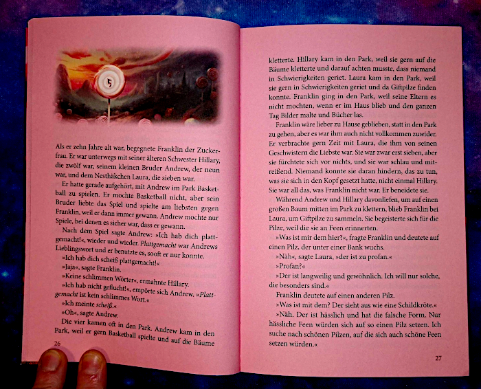 “ … Franklin hasst Kinder, er liebt Tiere und er hat eine Todesangst vor den Zuckermenschen. …“ (Seite 5)