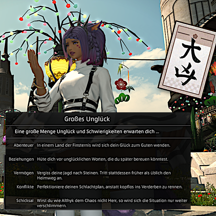 Vermissen werde ich das alte Jahr nicht wirklich, aus ganz verschiedenen Gründen. Wenn ich allerdings meinem Omikuji, also meiner Vorhersage für 2026, glaube, das ich vorhin beim Neujahrsevent in Final Fantasy XIV gezogen habe, dann erwartet mich nichts Gutes, aber hey, kopflos ins Verderben rennen oder unglückliche Worte wählen ist ja jetzt nichts Neues für mich.^^