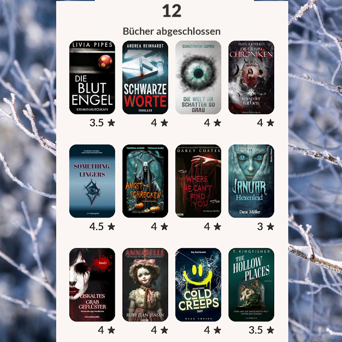Der erste Monatsrückblick 2026 kommt mal wieder mit etwas Verspätung, aber immer hin habe ich ihn nicht vergessen. Und ich muss sagen, mit 12 Büchern im Januar bin ich ganz gut gestartet. Erstaunlicherweise habe ich nur 4 Prints gelesen, dafür aber 8 eBooks, für mich eine doch etwas ungewöhnliche Aufteilung, aber ich war halt viel unterwegs. Und falls jemand fragen sollte, ob es ein Highlight gab: Ich habe „Something lingers“ von J. S. Mancapello sehr genossen, ein gruseliger kleiner Snack für zwischendurch auch „Annabelle“ hat mir, trotz der Jahre, die das Buch inzuwischen auf dem Buckel hat, eine Gänsehaut verursacht, aber Puppen sind auch gruselige kleine Dinger …^^ Außerdem kann ich euch „Schwarze Worte“ wärmstens empfehlen, auch weil sich in Andrea Reinhardts neuestem Thriller alles Buchmessen und das Verlagswesen dreht und da geht es sehr unschön zur Sache.