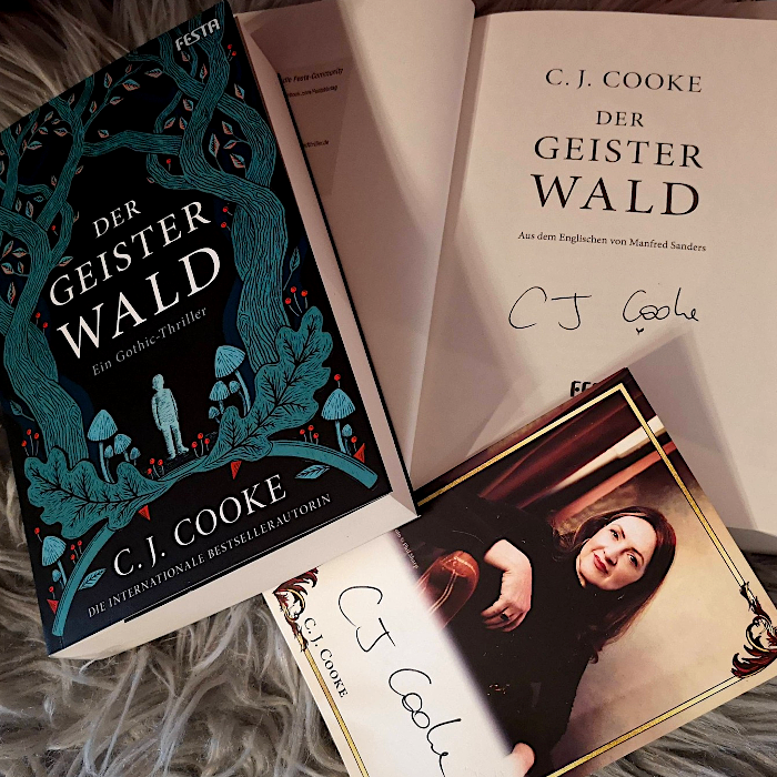Nach Laura Purcell und Brian Evenson war dieses Jahr C.J. Cooke zu Gast, die inzwischen mit zwei Titeln im Verlag vertreten ist, wobei „The Book of Witching“ nicht nur als Taschenbuchausgabe, sondern für die Messe auch als toll aufgemachte limitierte Hardcover-Sonderausgabe erschienen ist, eine tolle Geschichte, die ich euch nur wärmstens ans Herz legen kann. Ich fand sie so toll, dass ich gleich im Anschluss daran Buch Nummer 2, „Der Geisterwald“, gelesen habe und genau von dem habe ich euch eine signierte Ausgabe mitgebracht, als kleines Trostpflaster für alle Zuhausegebliebenen.